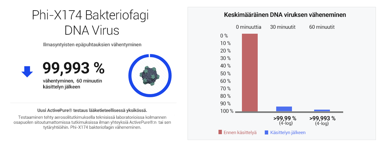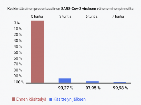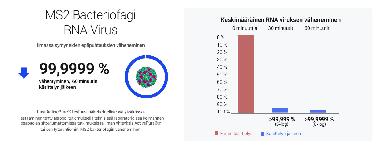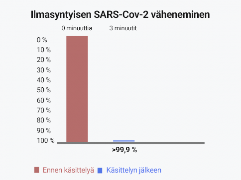 Testaaminen tehty MRIGlobal laboratorioissa kolmannen osapuolen sitoutumattomissa tutkimuksissa ilman yhteyksiä ActivePure®:n tai sen tytäryhtiöihin. SARS-Cov-2 viruksen vähentymisprosentit oli mitattu luonnollisella vähenemisnopeudella. Kontrolliryhmän ulkopuolella yli 99,9 % SARS-Cov-2 viruksen väheneminen.