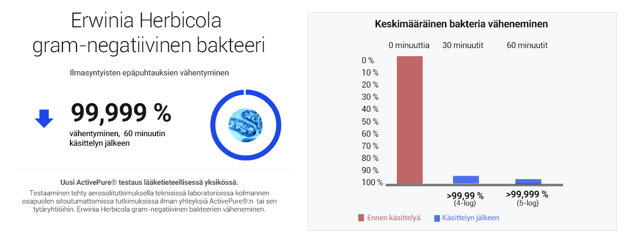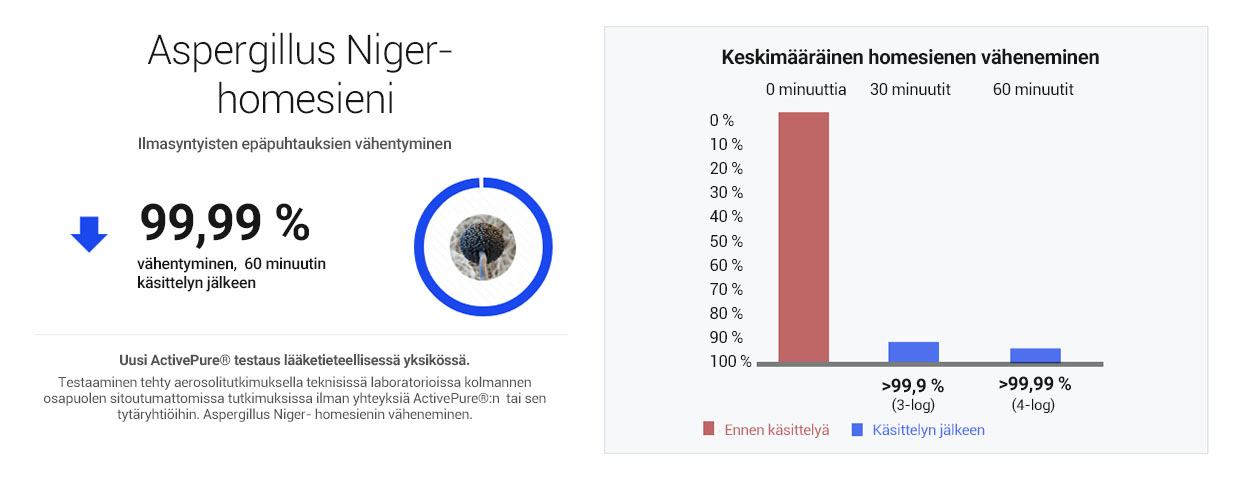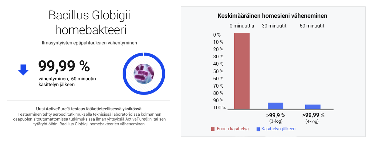Testaaminen tehty teknisissä laboratorioissa kolmannen osapuolen sitoutumattomissa tutkimuksissa ilman yhteyksiä ActivePure®:n tai sen tytäryhtiöihin.