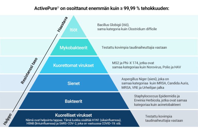 ActivePure® teknologian on todistettu olevan tehokas monia taudinaiheuttajia vastaan. Kaikilla taudinaiheuttajilla on erilainen resistanssi, jotka on nähtävillä hierarkkisesti alla olevassa kaaviossa.